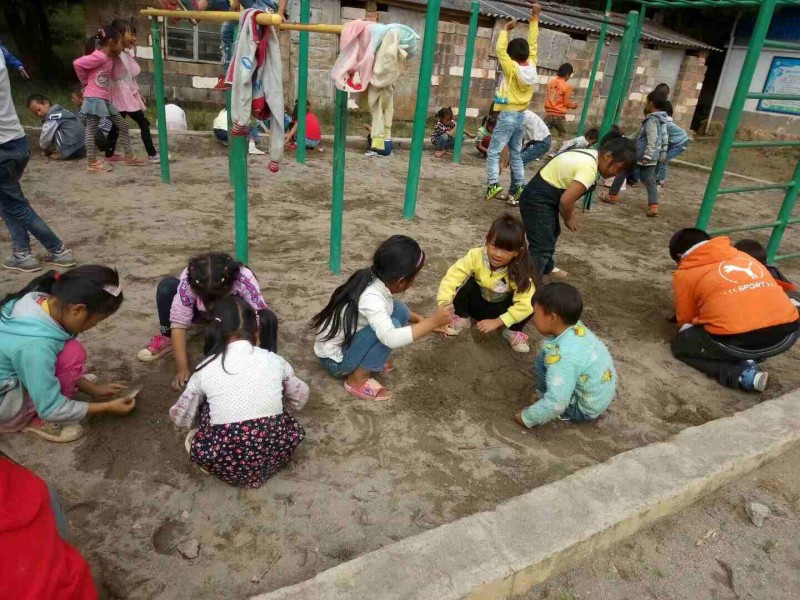 ▲孩子们在学校沙地玩耍,设施很简单,但他们也依旧玩得很开心