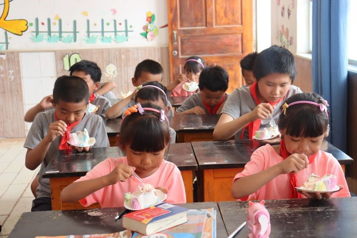 和小朋友一起切蛋糕,他们一脸享受地吃着~在城市里蛋糕不是什么稀奇物,但在他们眼中却非常珍贵。
